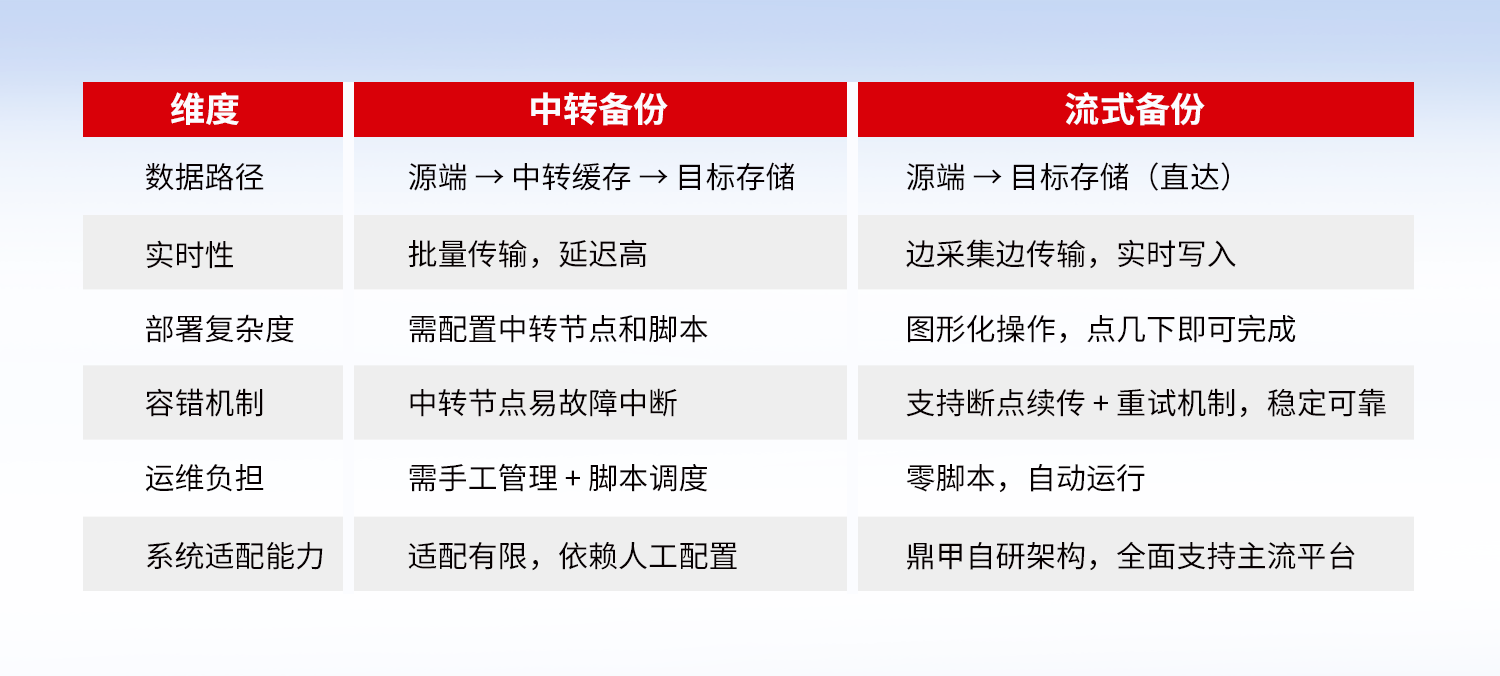 作為國產數據保護的頭部廠商,鼎甲早已落地成熟的流式備份方案,并廣泛應用于政企、金融、電信等關鍵行業。我們不是“腳本 + 緩存 + 中轉”的偽流式,而是真正實現了: