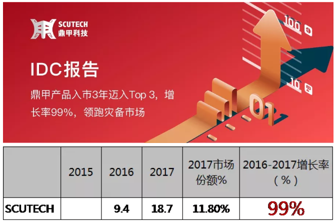 鼎甲科技于2009年成立,沉心研發6年,2015年首款產品問世。IDC最新發布的《中國備份一體機(PBBA)市場廠商份額》報告顯示:截至2017年,鼎甲在短短三年內,市場占有率已邁入TOP3。同時,在其它主流友商市場規模下滑的情況下,鼎甲快速追趕、逆勢增長,同比2016年增幅高達99%。