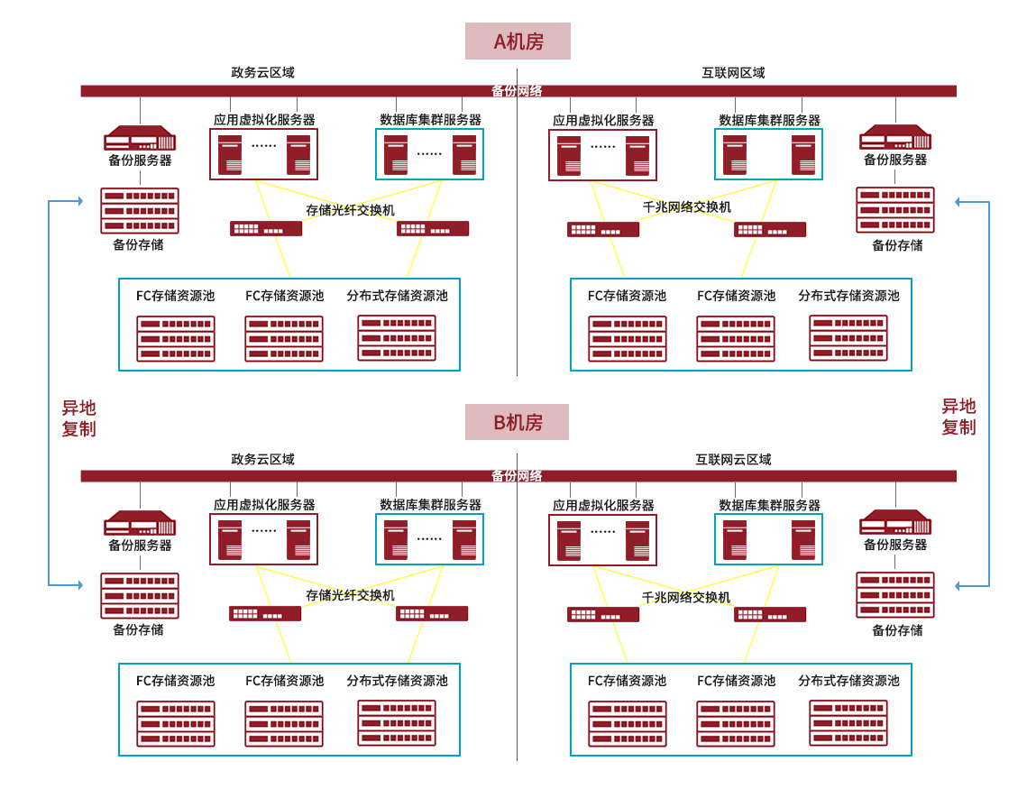 鼎甲在廈門電子政務(wù)云A、B機(jī)房的政務(wù)外網(wǎng)區(qū)和互聯(lián)網(wǎng)區(qū)分別部署了本地備份系統(tǒng),提供給互聯(lián)網(wǎng)區(qū)域、政務(wù)外網(wǎng)區(qū)域共300TiB的存儲容量,實(shí)現(xiàn)各自政務(wù)外網(wǎng)和互聯(lián)網(wǎng)區(qū)本地?cái)?shù)據(jù)備份保護(hù)。且兩地各網(wǎng)絡(luò)區(qū)域之間備份系統(tǒng)通過專線互聯(lián),實(shí)現(xiàn)了備份數(shù)據(jù)異地復(fù)制和異地存儲。