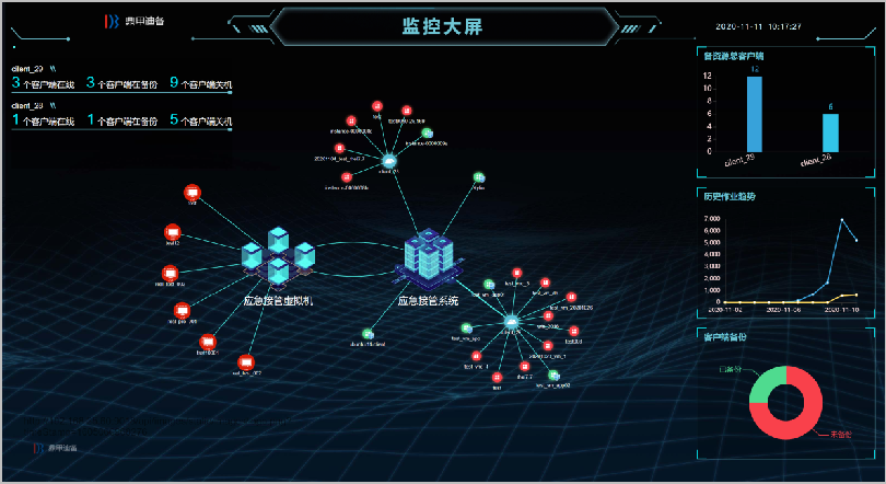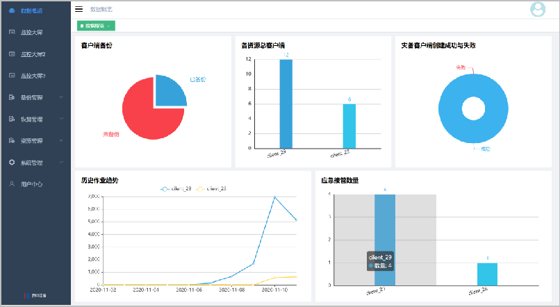 DBackup DRO還提供豐富的圖表功能,通過(guò)監(jiān)控大屏,備份or接管業(yè)務(wù)運(yùn)行的過(guò)程便可一目了然,包括應(yīng)急接管數(shù)量、備份數(shù)量、歷史作業(yè)趨勢(shì)、作業(yè)狀態(tài)等數(shù)據(jù)詳情盡在掌握。
