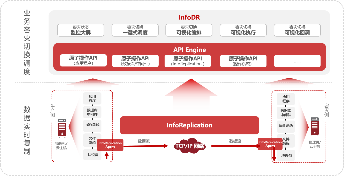 通過(guò)InfoReplication,可高效實(shí)現(xiàn)各類(lèi)企業(yè)級(jí)“數(shù)據(jù)容災(zāi)”場(chǎng)景,為業(yè)務(wù)數(shù)據(jù)提供持續(xù)穩(wěn)定的容災(zāi)保護(hù),搭配InfoDR,可“升級(jí)”進(jìn)階為“準(zhǔn)雙活應(yīng)用容災(zāi)”,為業(yè)務(wù)應(yīng)用提供自動(dòng)化可視化的容災(zāi)管理。