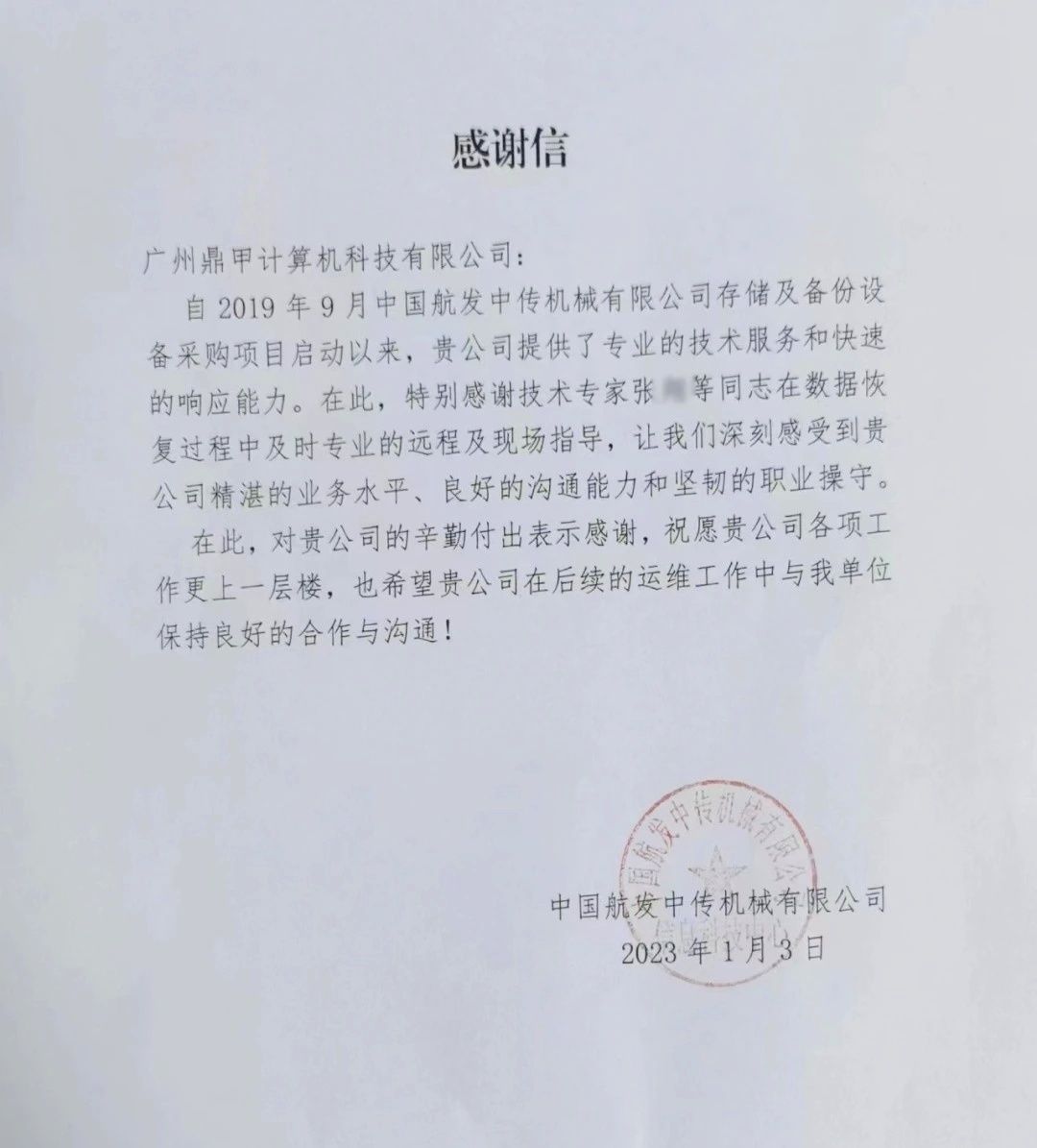 喜獲中國航發中傳公司感謝 | 鼎甲快速響應,保障數據安全無憂!