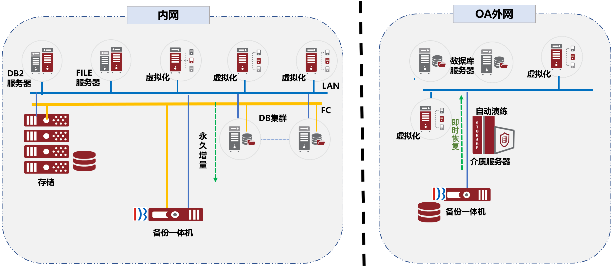針對(duì)客戶需求,鼎甲將兩套備份一體機(jī)分別部署在生產(chǎn)環(huán)境與 OA 外網(wǎng),作為備份平臺(tái)的核心,負(fù)責(zé)管理整個(gè)備份環(huán)境,包括備份、存檔和還原,在確保業(yè)務(wù)管理系統(tǒng)數(shù)據(jù)安全性的同時(shí),支持未來(lái)的業(yè)務(wù)拓展和新平臺(tái)上線的備份支撐。
