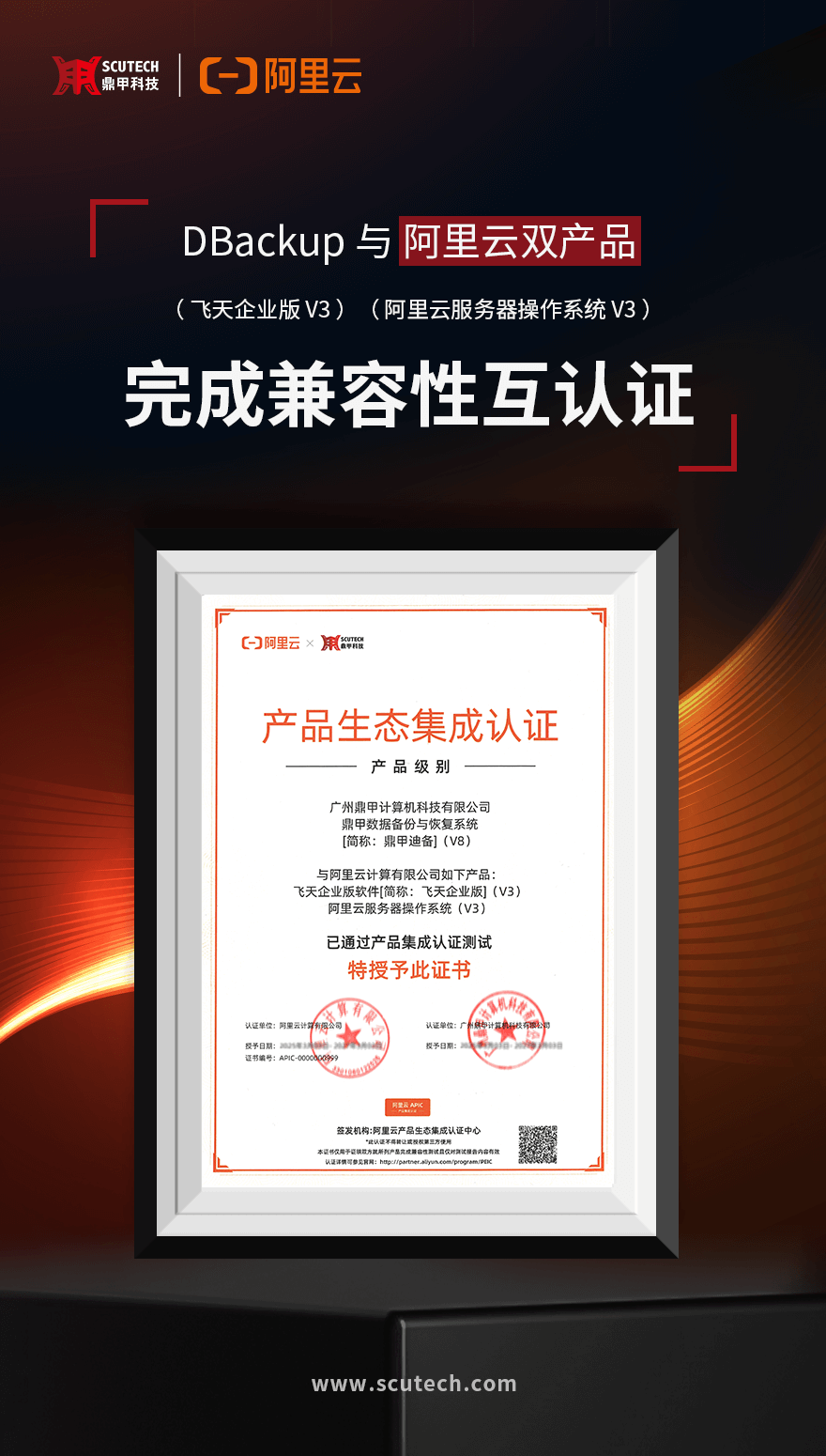 近日,鼎甲自主研發(fā)的核心產(chǎn)品數(shù)據(jù)備份與恢復(fù)系統(tǒng)( DBackup )V8版本,成功通過(guò)阿里云產(chǎn)品生態(tài)集成認(rèn)證,順利完成與飛天企業(yè)版軟件(V3)及阿里云服務(wù)器操作系統(tǒng)(V3)的深度兼容性測(cè)試,獲得阿里云官方頒發(fā)的產(chǎn)品集成認(rèn)證證書(shū)。