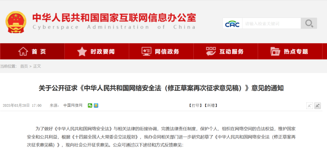 2025年3月28日,《中華人民共和國網絡安全法(修正草案再次征求意見稿)》發布公示。其中新增條款明確指出: