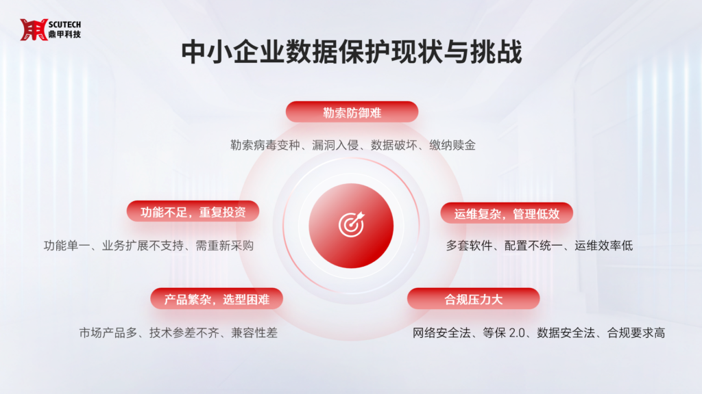 隨著數(shù)字化轉(zhuǎn)型的深入,中小企業(yè)面臨的挑戰(zhàn)愈加突出:勒索病毒頻發(fā),數(shù)據(jù)安全岌岌可危;市場(chǎng)產(chǎn)品繁雜、兼容性參差不齊;運(yùn)維力量有限,難以承擔(dān)復(fù)雜的配置和維護(hù);合規(guī)壓力不斷增加,但缺乏專業(yè)團(tuán)隊(duì)支撐。許多企業(yè)在采購(gòu)過(guò)程中,不得不在“成本可控”與“安全合規(guī)”之間艱難權(quán)衡。