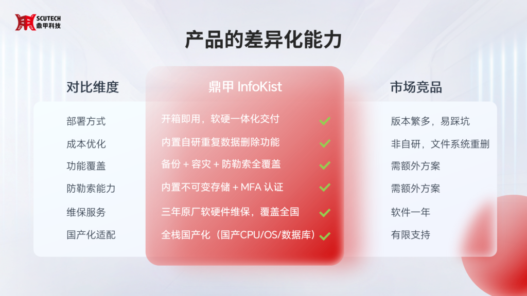在大型企業(yè)級(jí)市場(chǎng)積累的技術(shù)沉淀和規(guī)模化應(yīng)用,也成為鼎甲此次產(chǎn)品的獨(dú)特優(yōu)勢(shì)。例如,自主研發(fā)的重復(fù)數(shù)據(jù)刪除技術(shù)幫助企業(yè)節(jié)省存儲(chǔ)成本,同時(shí)保持高效容錯(cuò)減少備份用時(shí);多層次防勒索保護(hù)機(jī)制確保備份數(shù)據(jù)“不可識(shí)別、不可篡改、不可刪除”,確保數(shù)據(jù)的固若金湯;而廣泛的兼容性則讓產(chǎn)品同時(shí)支持國(guó)產(chǎn) CPU、國(guó)產(chǎn)操作系統(tǒng)、國(guó)產(chǎn)數(shù)據(jù)庫(kù)和國(guó)產(chǎn)虛擬化環(huán)境,幫助企業(yè)在信創(chuàng)環(huán)境下也能穩(wěn)定運(yùn)行。