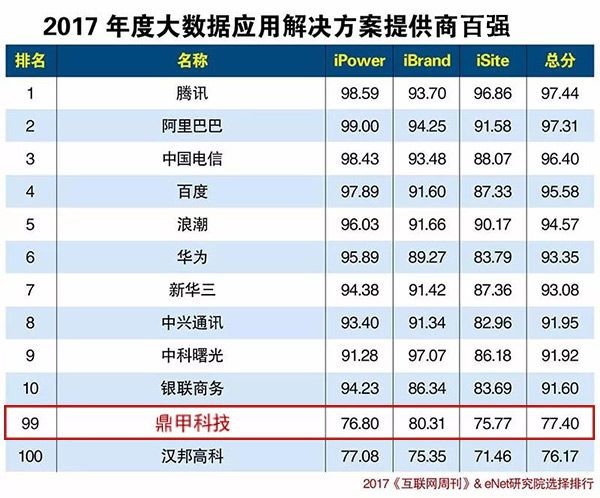 鼎甲與BAT一同列席《2017年度大數(shù)據(jù)應用解決方案提供商百強》
