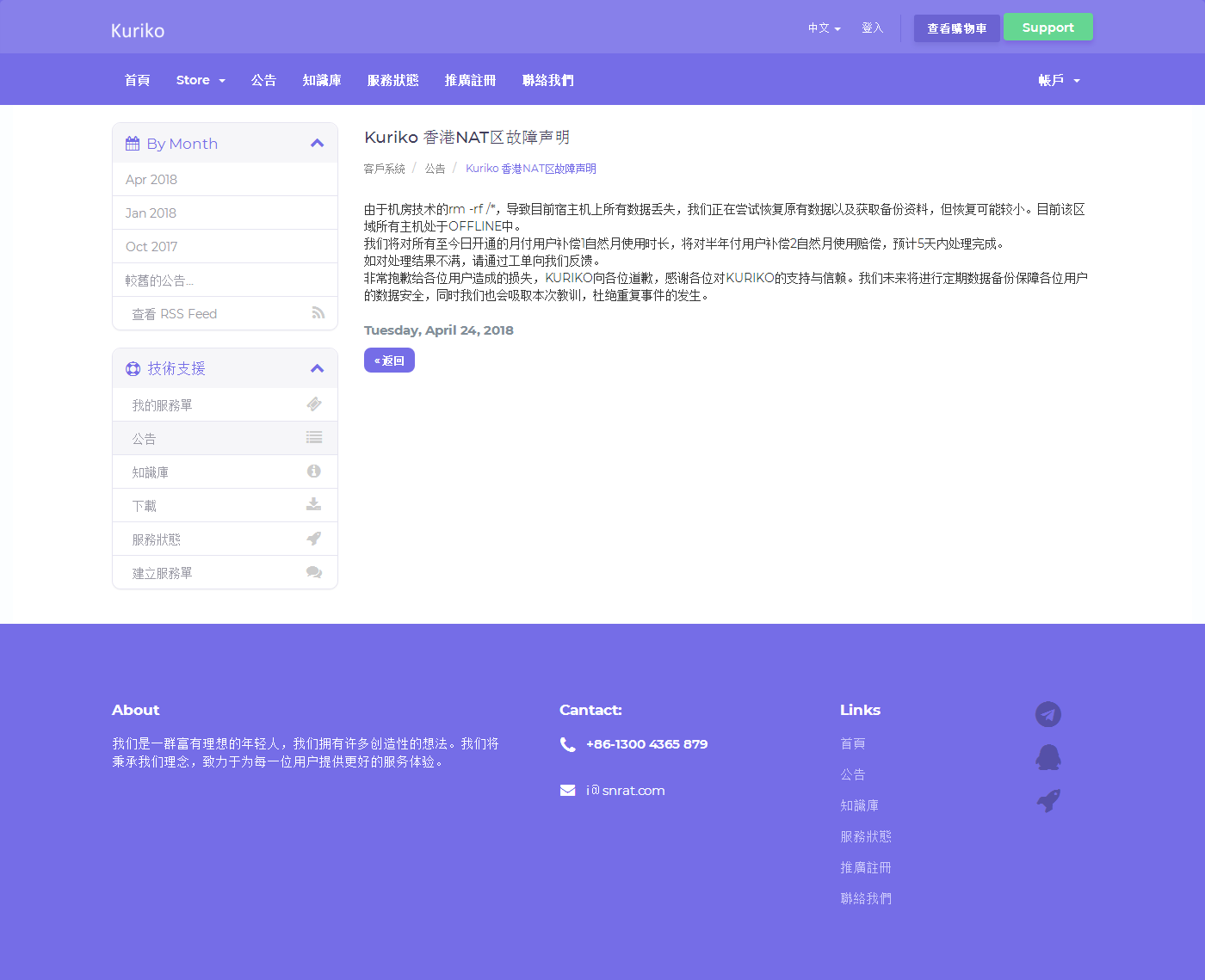 Kuriko 4月24日在其官網刊登香港NAT區故障聲明。