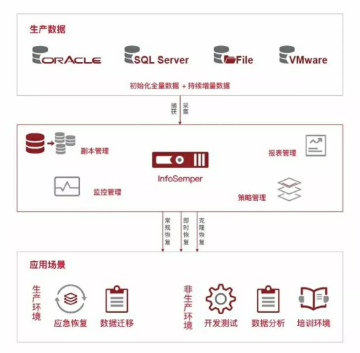 InfoSemper 利用客戶端應用資源的專用接口捕獲生產環境中的文件、數據庫等數據,基于快照數據建立多副本管理體系,通過副本掛載實現數據的即時恢復,既可以支持生產環境的應急使用,又可以支持非生產環境的開發、測試、數據分析等使用。