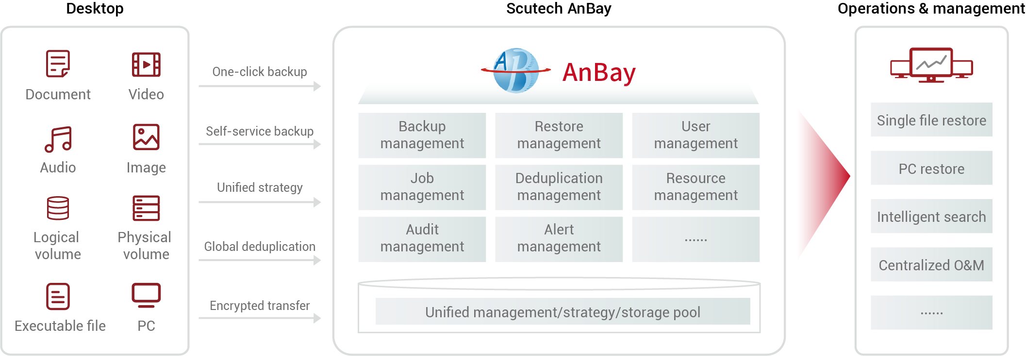 AnBay provides diversified backup and restore strategies, centralized management, and log auditing capabilities to protect enterprises’ desktop data assets and simplify the complexity of operations.