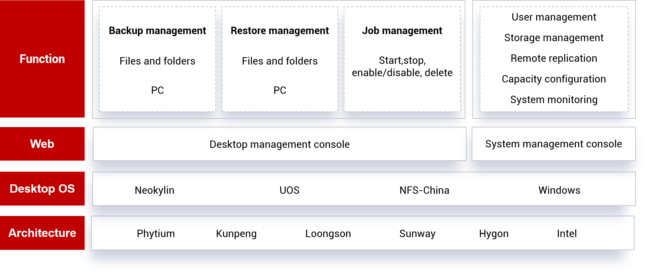 Functionality: Covers functions such as backup management, restore management, job management, user management, storage management, remote replication, capacity configuration, and system monitoring.